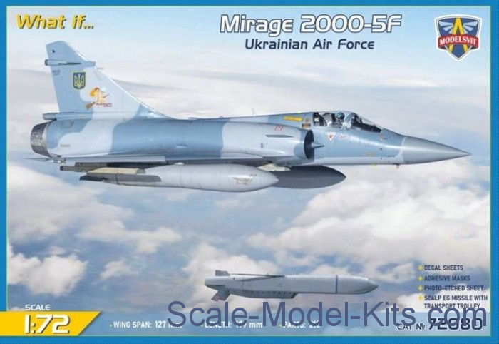 Mirage 2000-5F Ukrainian Air ForceSKU: MSVIT72080Manufacturer: ModelSvit Scale: 1:72 Price: $47.50 Plastic model kit in 1/72 scale Mirage 2000-5F Ukrainian Air Force (ModelSvit No.72080) Length, mm: 199 Wing span, mm: 127 This set includes: